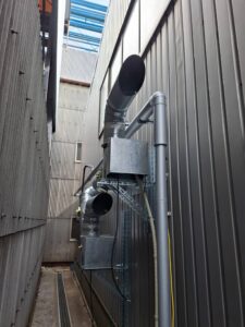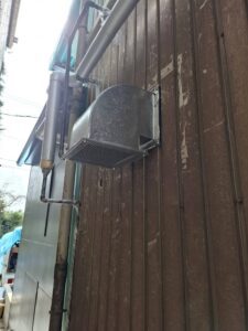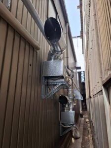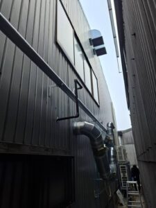 特に今回は製麺所ということもあり、大型の茹で機から出る大量の蒸気や粉塵に対応できるよう、大風量タイプの排煙設備を設置しています!