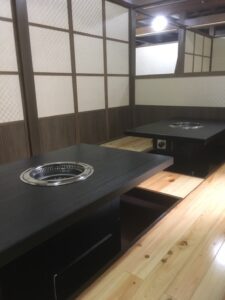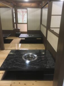 文化芸術村の跡地という歴史ある建物を活かしつつ、新たに無煙ロースター8台の設置とダクト工事一式を行いました。店内の雰囲気に合わせた天板を選定することで、落ち着きと上質感を兼ね備えた空間を演出しています。