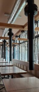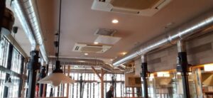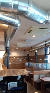 福工大駅前にオープンした「萬まる」九州一号店様では、全席に当社施工の上引きフードを導入し、煙が気にならない快適な空間を実現しました。店内で本格的な炭火焼肉を楽しんでいただけるよう、しっかりと煙を吸気・排気するだけでなく、配管を隠さずにあえてスタイリッシュに見せるデザインにもこだわっています。屋外の配管に至るまで丁寧に施工し、機能性とデザイン性を両立させた上質な店内環境をお届けいたします。