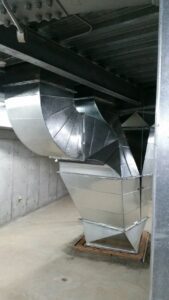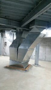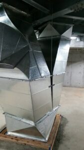 今回ご紹介するのは、地下階の限られたスペースに合わせて製作・施工した空調ダクト事例です。梁や配管などの障害物を避けながら、複雑な角度と曲面を組み合わせることで、効率的かつ安全な空気の流れを実現しています。当社は、このようなマニアックな角ダクトも製作します。